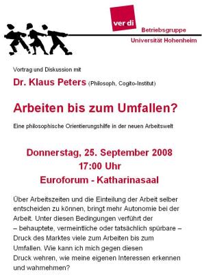 Wir beschäftigen uns mit der Frage, wie moderne Führungsmethoden und Arbeitszeitmodelle bei unserer täglichen Arbeit hier an der Universität neue Gestaltungsspielräume bieten, aber auch zu neuen Ansprüchen und Zwängen führen, denen wir nicht wie früher üblich mit Streik, Beschwerden und Personalrat begegnen können. Das Bewusstsein über eigene Interessen und über Methoden ihrer Wahrung ist uns dabei wichtig: Wie kann ich meine Work-Life-Balance verwirklichen und angemessene Arbeitsbedingungen (wie Arbeitszeit und Bezahlung) erreichen? Welche Methoden und Mittel stehen mir dazu zur Verfügung?